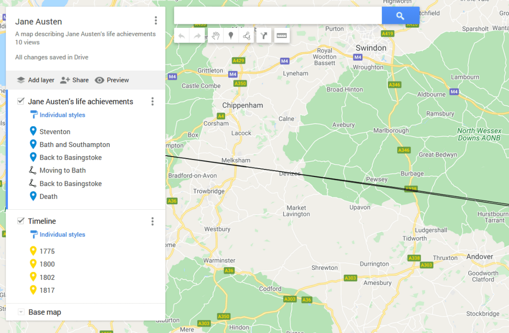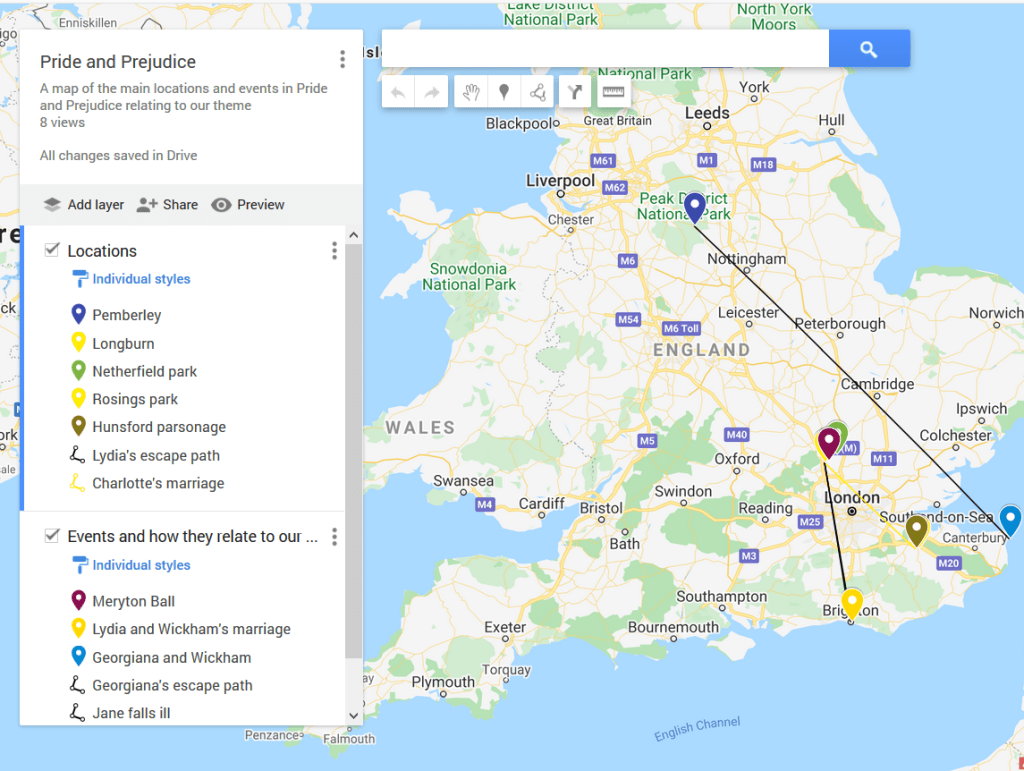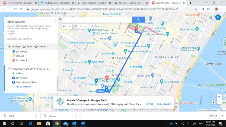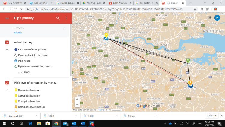 Although life has been much of a whirlwind lately, what the digital world has had to offer has been remarkable in terms of the positive impact it has made. This week, we learned a tool that helps us map a text. What does mapping a text mean you may ask? Simply, mapping a literature text means visually putting all distinctive locations of that text on a map. While there are so many tools to map a novel, we focused on using Googlemymaps. In this blog we will discuss our journey to map the life achievements of three authors; Charles Dickens, Jane Austin, Edith Wharton, and their novels Great Expectations, Pride and Prejudice and House of mirth, respectively.