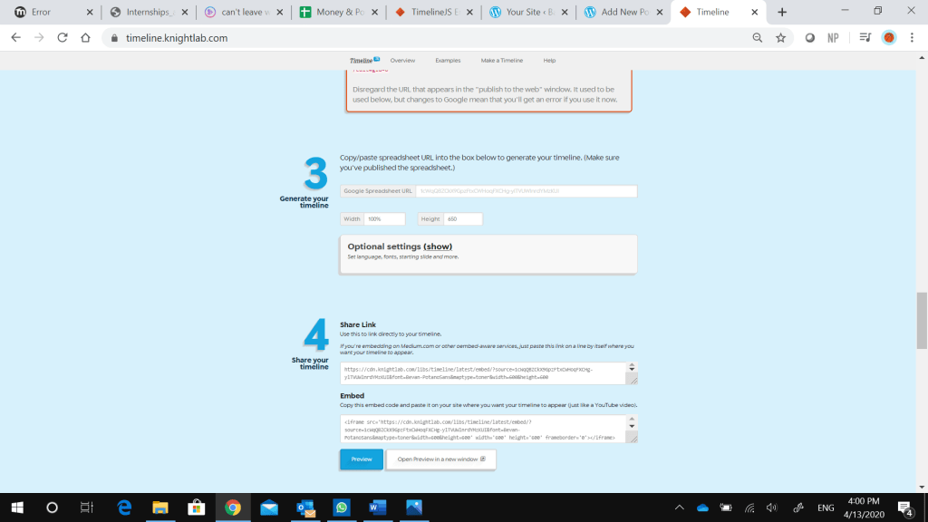 Once done with the project, it is time to release this beauty to the public. You can achieve this final step by pressing file, publish to the web , and copying the link displayed in front of you. The second step is to paste this link into Timelineknightlab “step 3” which will generate a new link in “step 4” and then click on preview. Finally, share the link with your friends for them to view your eye-catching project.